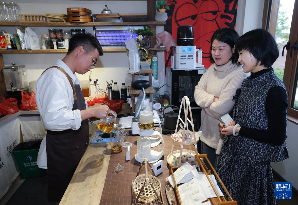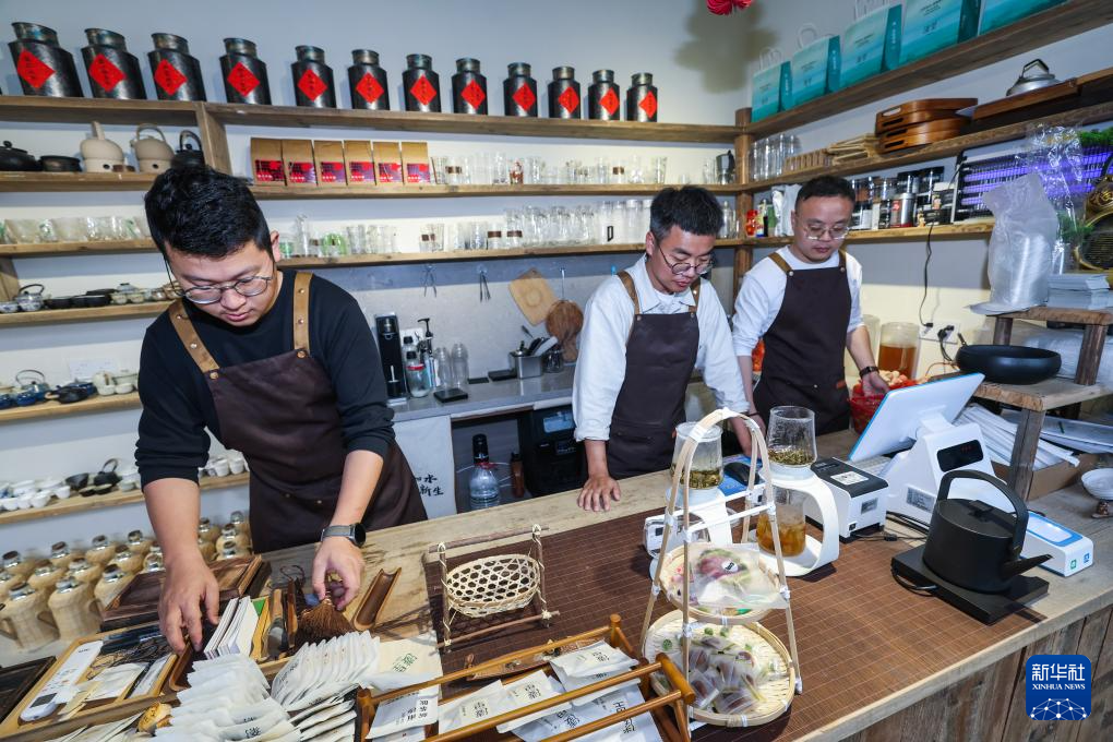 4月23日,青创客何捷(左)、孙涛(中)、谈再恒(右)在位于湖州吴兴高新区幻溇美食街的溇里·茶文化空间的工作间制作饮品。这里以传统老茶馆为基调,在吴兴高新区政策扶持、场地配套、业态对接等全链条服务下,融合现代休闲体验,打造集茶艺文化、创意生活、休闲旅游于一体的复合型文化空间,探索年轻化、场景化的乡村文旅新范式。新华社记者 徐昱 摄