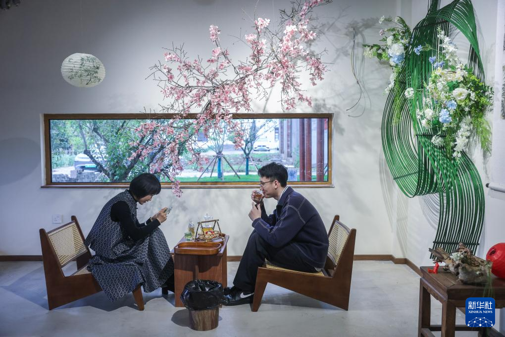 4月23日,游客在位于湖州吴兴高新区幻溇美食街的溇里·茶文化空间内喝茶。这里以传统老茶馆为基调,在吴兴高新区政策扶持、场地配套、业态对接等全链条服务下,融合现代休闲体验,打造集茶艺文化、创意生活、休闲旅游于一体的复合型文化空间,探索年轻化、场景化的乡村文旅新范式。新华社记者 徐昱 摄