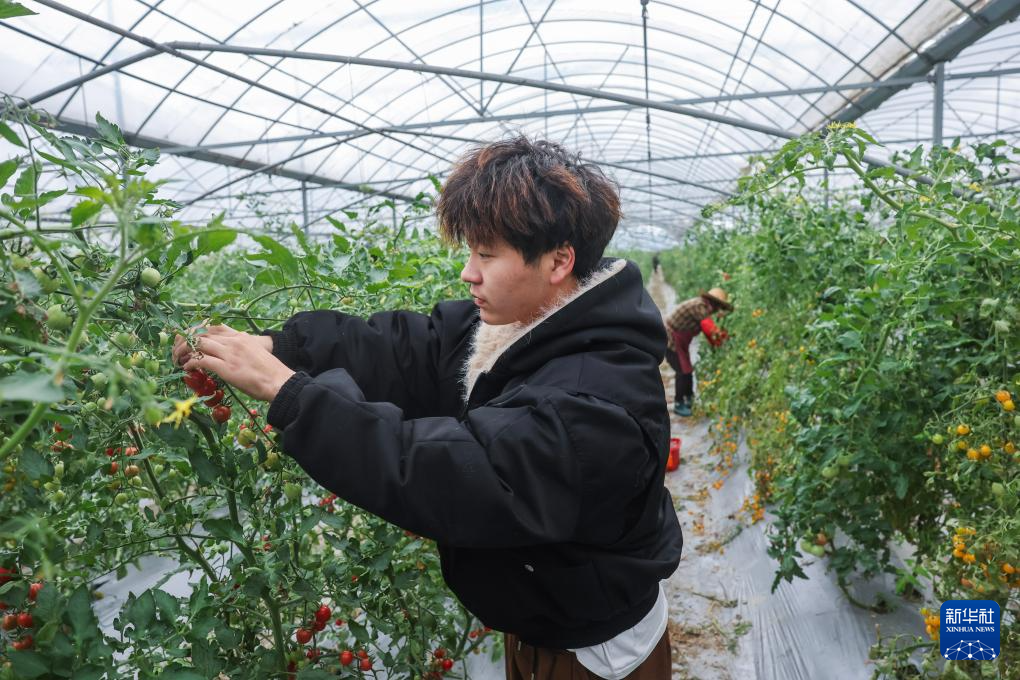 4月23日,在位于湖州吴兴区织里镇伍浦村的伟祥精品农业园,青创客张帅在大棚内采摘番茄。该农业园种植有豆芽、番茄、灵芝、羊肚菌等,年产值1300万元。农业园以“公司+合作社+农户”形式发展订单农业,每年签订优质果蔬订单800吨,带动规模种植主体80余户,带领周边2000余户致富增收。新华社记者 徐昱 摄