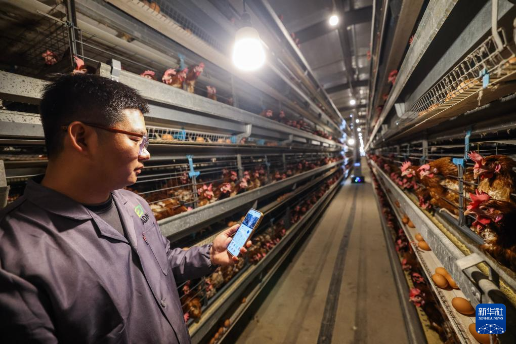 4月23日,在湖州市吴兴区妙西镇石山村湖州绿盛生态农业有限公司车间内,“90后”农创客刘文超在查看智能巡检机器人实时传回的画面和温度湿度数据。他本是一名互联网大厂程序员,回到父亲养鸡场后,创立了湖州绿盛生态农业有限公司,主导建成9栋数字化鸡舍,搭建蛋禽养殖数字平台,全面应用自动喂料、集蛋、清粪等设备,养殖效率大幅提高。新华社记者 徐昱 摄