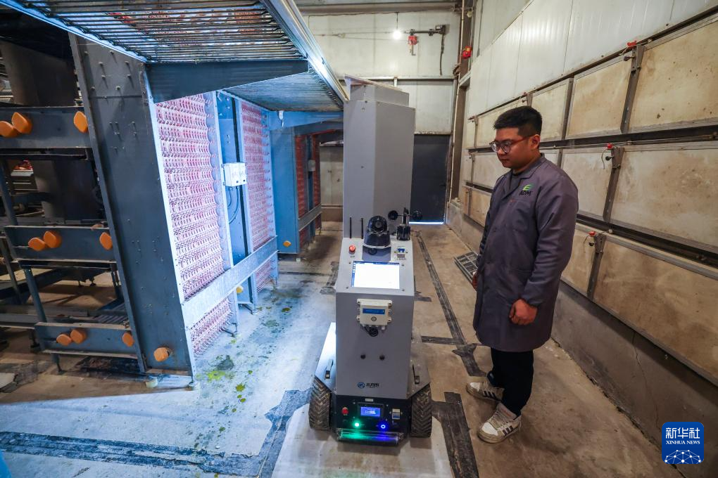 4月23日,在湖州市吴兴区妙西镇石山村湖州绿盛生态农业有限公司车间内,“90”后农创客刘文超在查看智能巡检机器人的运行状态。他本是一名互联网大厂程序员,回到父亲养鸡场后,创立了湖州绿盛生态农业有限公司,主导建成9栋数字化鸡舍,搭建蛋禽养殖数字平台,全面应用自动喂料、集蛋、清粪等设备,养殖效率大幅提高。新华社记者 徐昱 摄